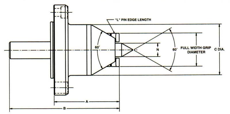 The Type 49 Series allows a driving diameter of 2.72" to 3.90". The driving pins move independently to allow a five-degree pitch of the end face of the work-piece. The mechanical compensation and lock down center point allow a constant length to be held from center to the taper. The Type 49 Series is available in a flange mount. Chuck mounting can be achieved as described in the mounting procedures. View Catalog Page